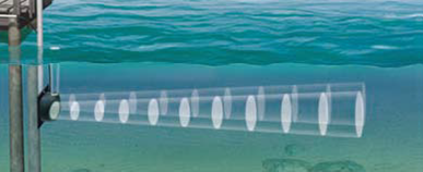 To measure cross-channel water currents, the Argonaut ADCP transmits beams of sound pulses and calculates current velocities from the received ‘echoes’ reflected from suspended particles.