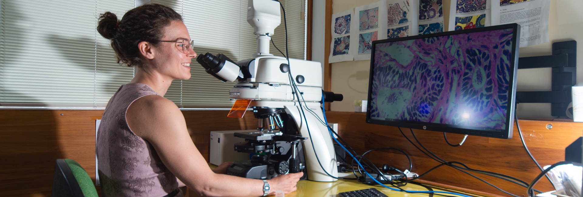 Adele Dutilloy in the microscope lab at Greta Point, looking for sperm stored in shark tissue.