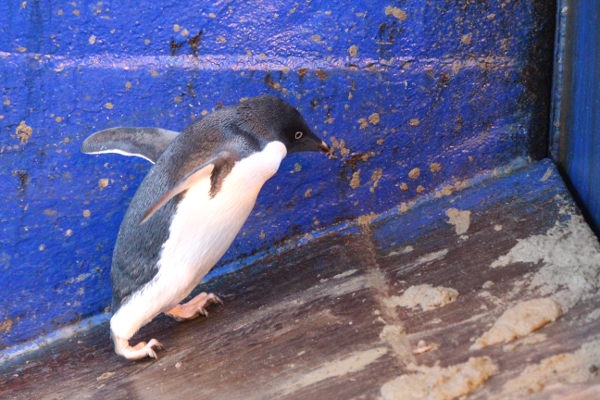 An Adelie penguin climbs the stern ramp of Tangaroa.