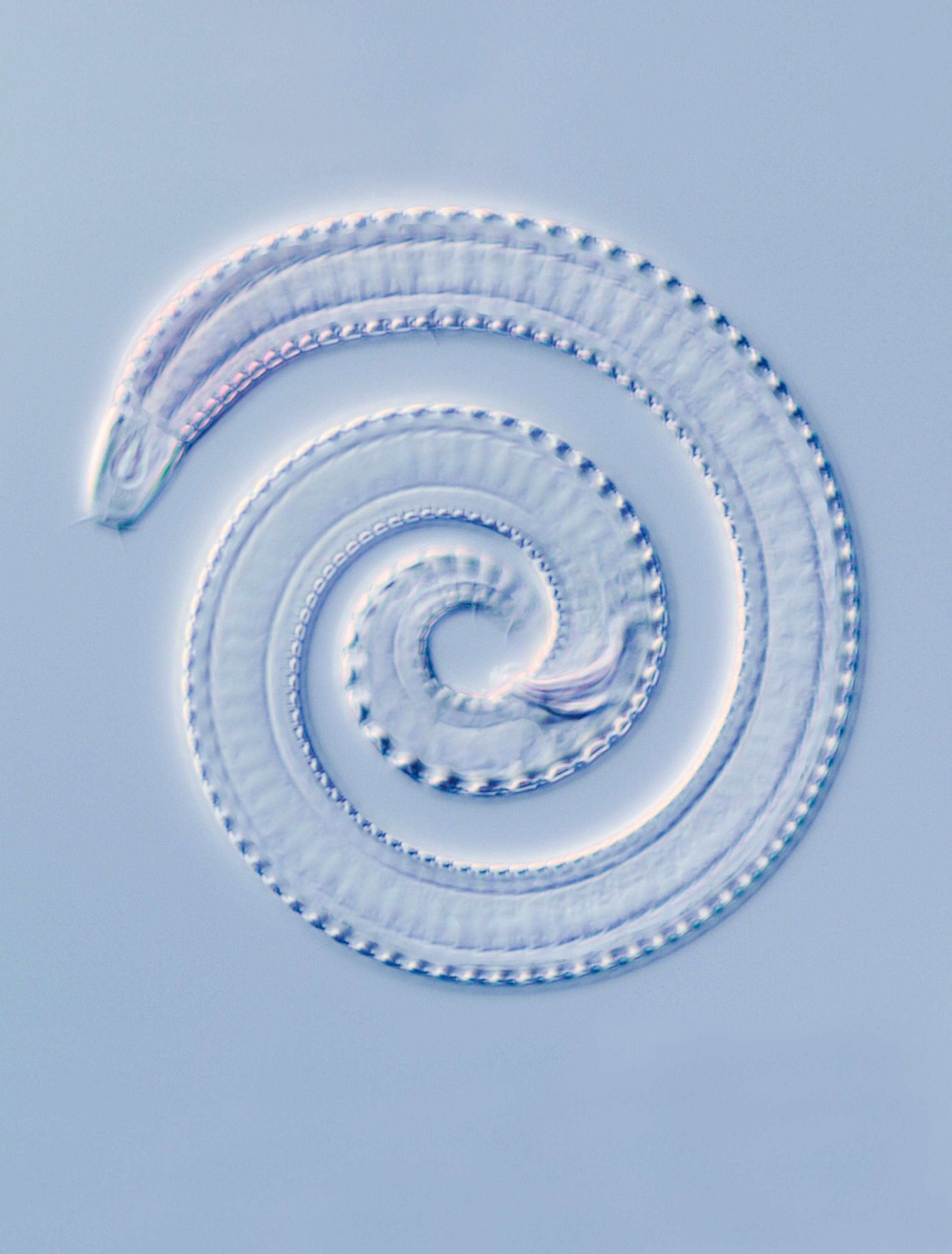 The intricate structure of this adult male nematode of the genus Metadasynemella is captured beautifully when magnified 400 times under a compound microscope. The specimen is about 0.75mm across, and was collected from an area on the Chatham Rise, east of mainland New Zealand, rich in phosphorite nodule deposits.