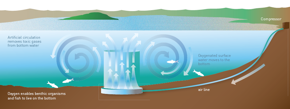 Aeration creates a mixing current, preventing cold bottom waters from turning anoxic. Credit: NIWA