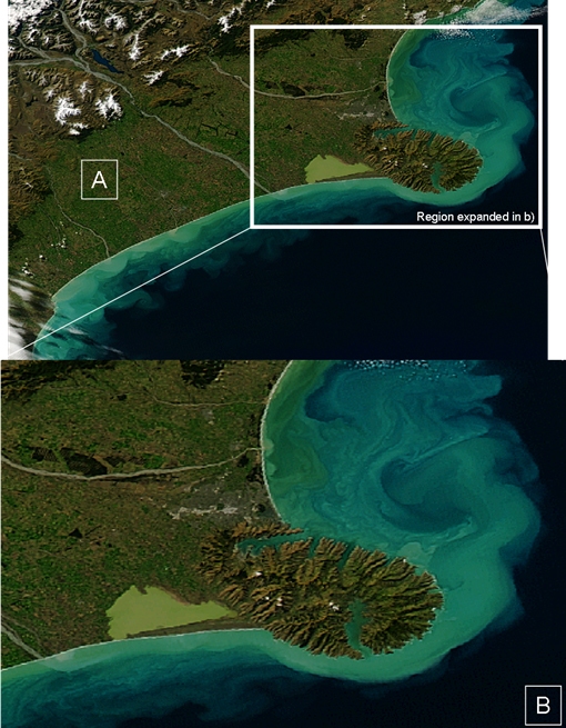 Aerial view of Canterbury Bight showing the highly coloured plume coming out of Lake Elsmere. Credit: NIWA