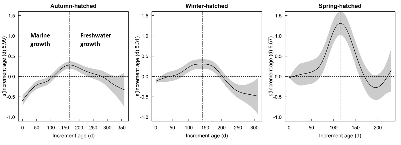 Age-dependent growth rates during marine and freshwater life of autumn, winter and spring-hatched inanga. Partial effects plots from the GAMMs for fitted smoothers of age-dependent growth rates among hatch-seasons. The estimated degrees of freedom (EDF) are shown on the y-axis. The dashed line is the model intercept and the grey shaded lines are the 95% confidence intervals of the predicted smoothers. Note the varying scales on the x-axes.