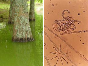 Left hand side: an algal bloom. Right hand side: Anabaena, a genus of filamentous cyanobacteria that exists as plankton.