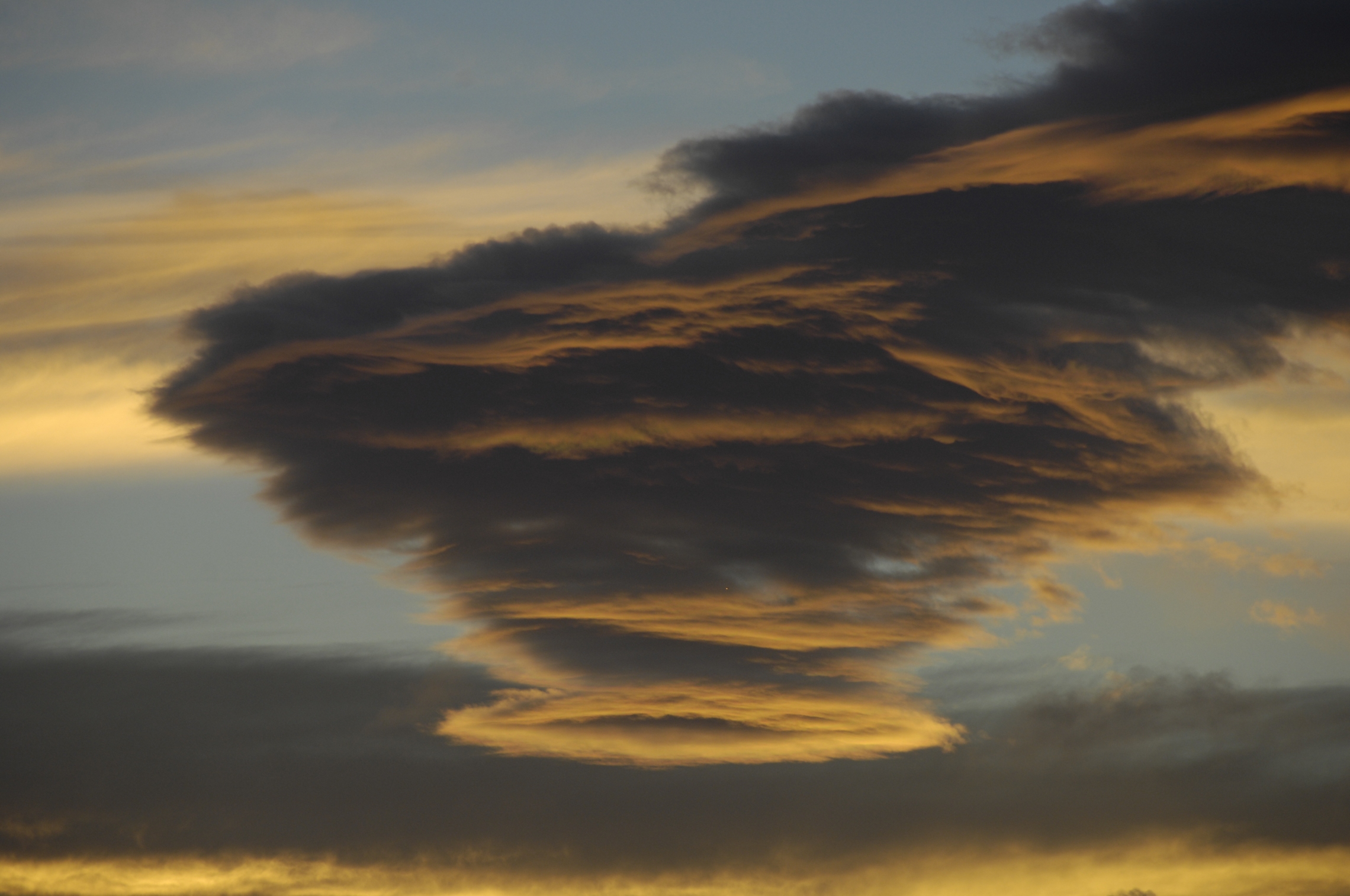 This image shows altocumulus in the centre and cirrus in the background. Altocumulus occurs in waves or rounded patches between 2000m and 6000m above ground level. Cirrus clouds are made of ice crystals cirrus clouds and are usually found at altitudes of 5000m or more in New Zealand. Photo taken by Alan Blacklock in 2007.