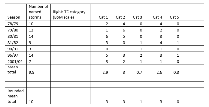 Potentially, four cyclones may reach category 3 or 4 status. The long term tropical cyclone climatology (last 40 years) suggests the occurrence of a Category 5 system is very low.