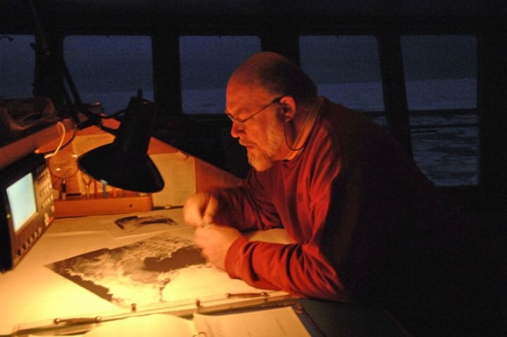 Tangaroa Master Andrew Leachman studying an ice map on the bridge.