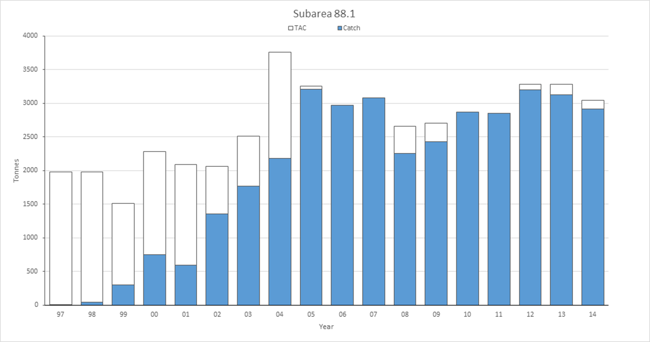 The annual catch and catch limit of Antarctic toothfish (metric tonnes) in the Ross Sea fishery.