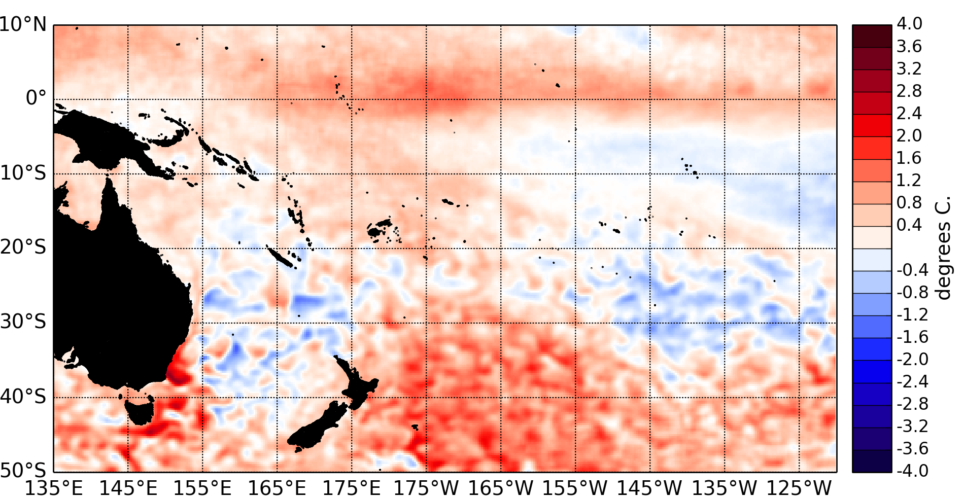 Surface temperature anomalies (ºC) for May 2014, data is from the NOAA OISST Version 2 dataset, available at the NOAA’s Climate Data Center (ftp://ftp.cdc.noaa.gov/Datasets/noaa.oisst.v2.highres/).