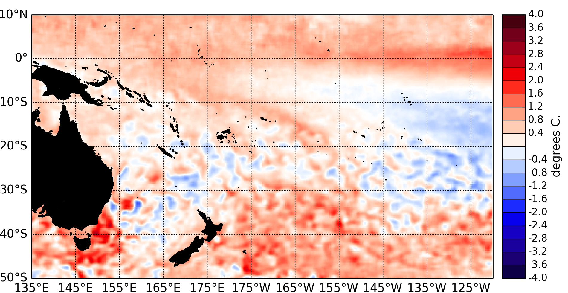 Surface temperature anomalies (ºC) for June 2014, data is from the NOAA OISST Version 2 dataset, available at the NOAA’s Climate Data Center (ftp://ftp.cdc.noaa.gov/Datasets/noaa.oisst.v2.highres/).