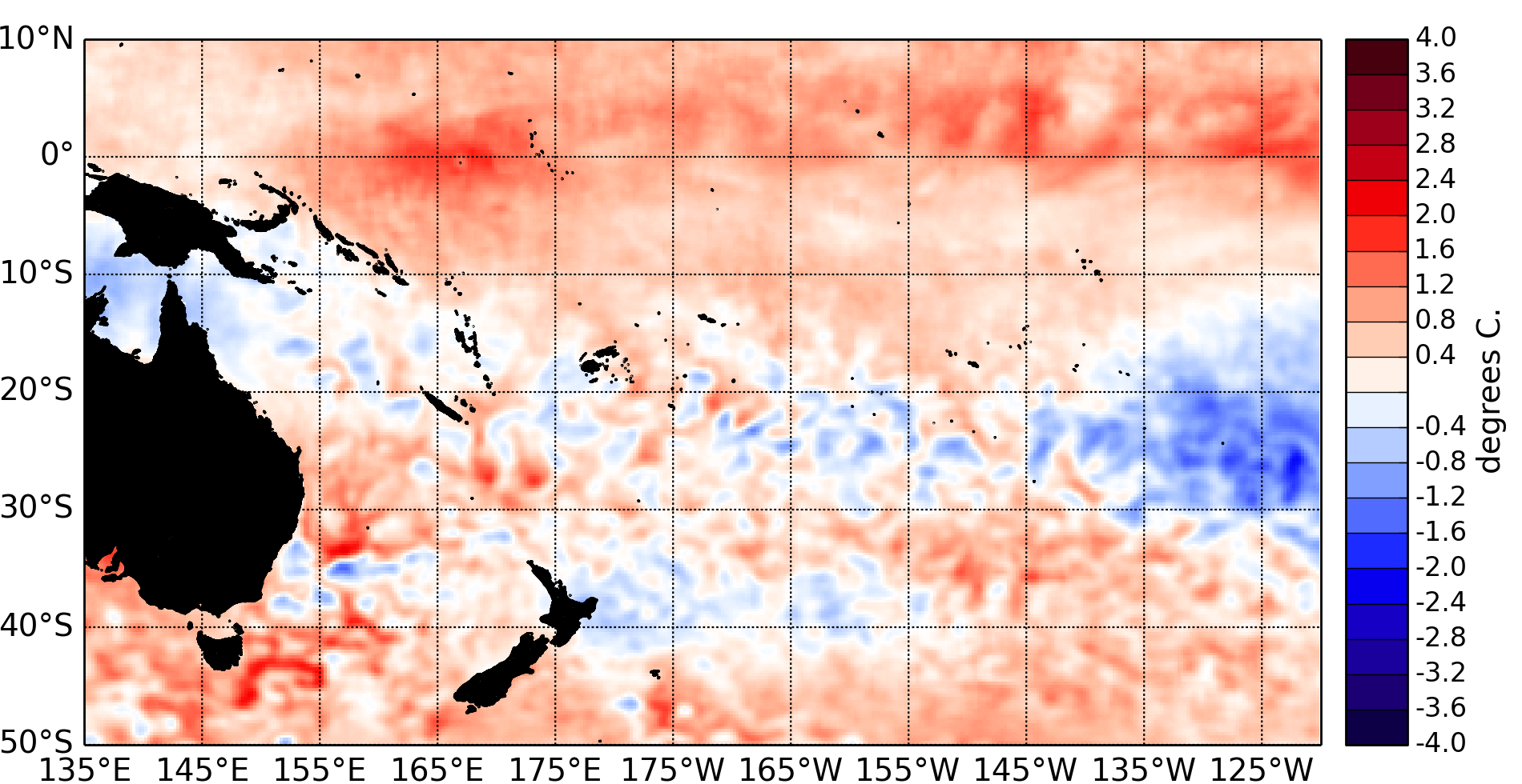 Surface temperature anomalies (ºC) for November 2014, data is from the NOAA OISST Version 2 dataset, available at the NOAA’s Climate Data Center (ftp://ftp.cdc.noaa.gov/Datasets/noaa.oisst.v2.highres/).