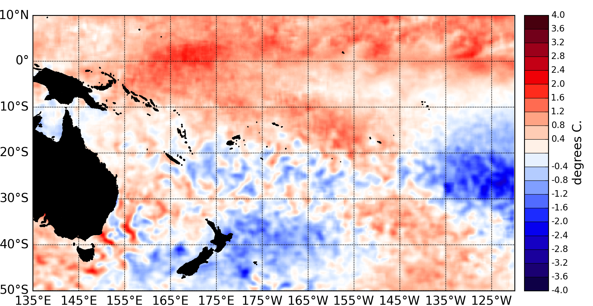 Surface temperature anomalies (ºC) for December 2014, data is from the NOAA OISST Version 2 dataset, available at the NOAA’s Climate Data Center (ftp://ftp.cdc.noaa.gov/Datasets/noaa.oisst.v2.highres/).