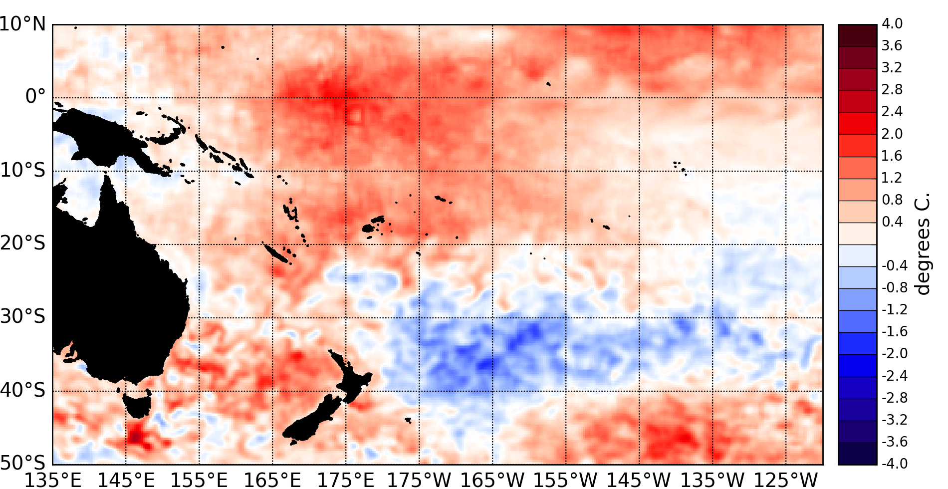 Surface temperature anomalies (ºC) for February 2015, data is from the NOAA OISST Version 2 dataset, available at the NOAA’s Climate Data Center (ftp://ftp.cdc.noaa.gov/Datasets/noaa.oisst.v2.highres/).