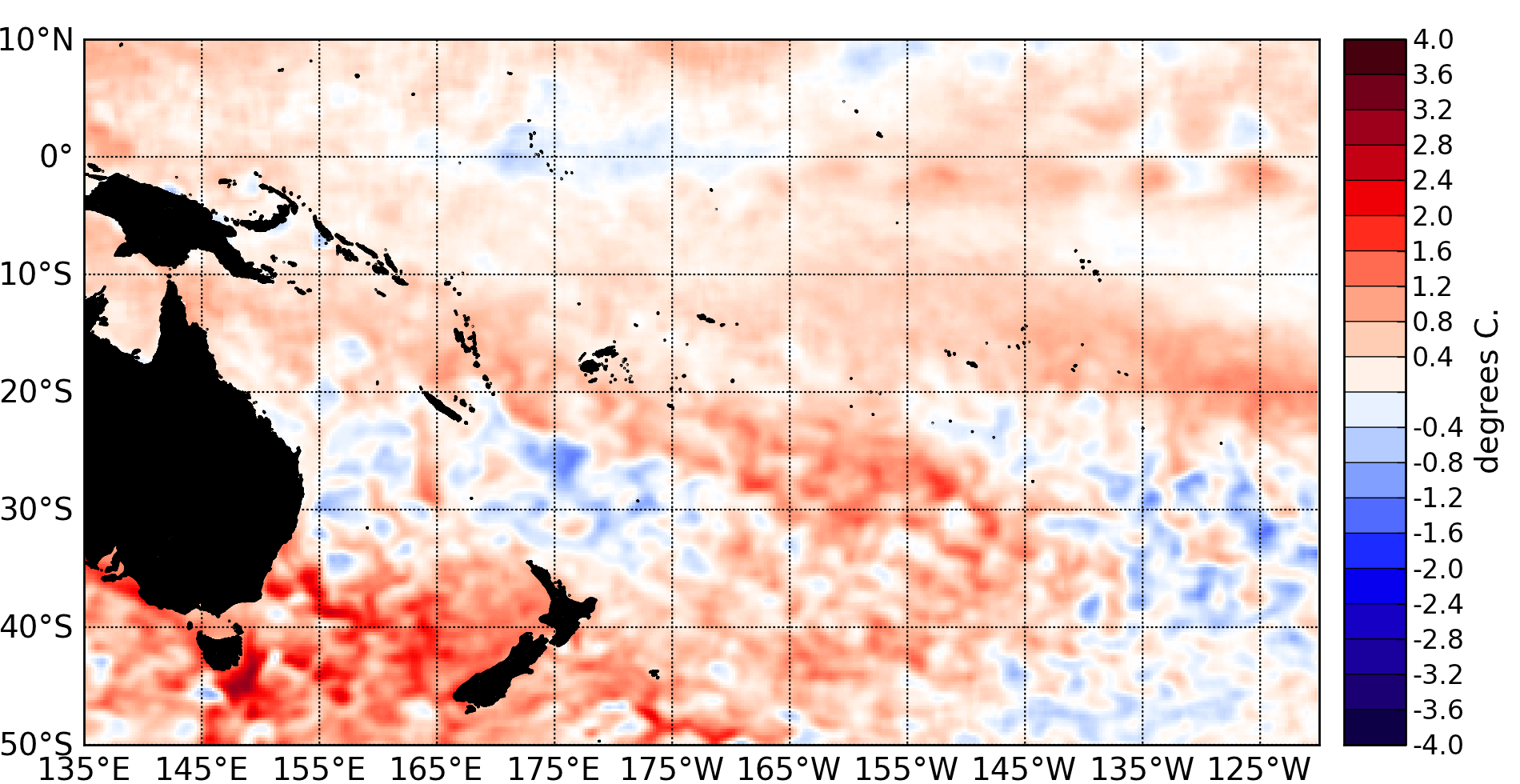 Surface temperature anomalies (ºC) for April 2013, data is from the NOAA OISST Version 2 dataset, available at the NOAA’s Climate Data Center (ftp.cdc.noaa.gov/Datasets/noaa.oisst.v2.highres).