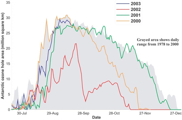 The area of the Antarctic ozone hole for 2003 compared to 2000, 2001, and 2002.