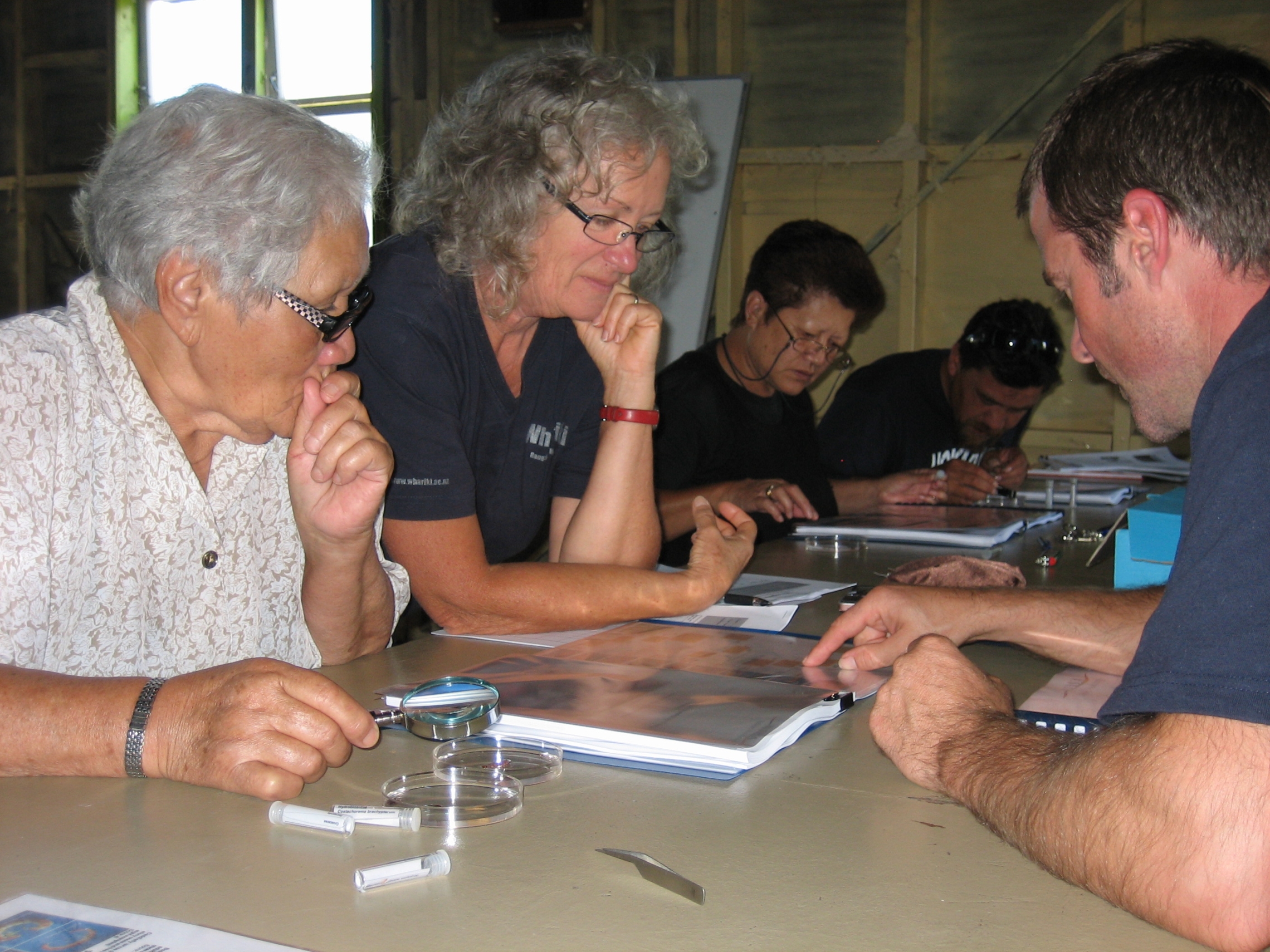 Aslan Wright-Stow working with Te Roopū Taiao o Utakura to identify invertebrates from the Utakura River. Credit: Wakaiti Dalton.