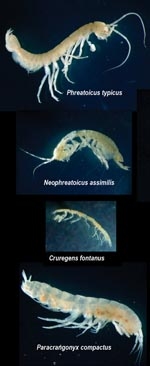 An assortment of stygofauna: Phraetoicus typicus, Neophreatoicus assimilis, Cruregens fontanus, Paracrangonyx compactus.