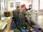 Atmospheric scientists at work in our crowded container lab. (Photo: Dawn Devries)