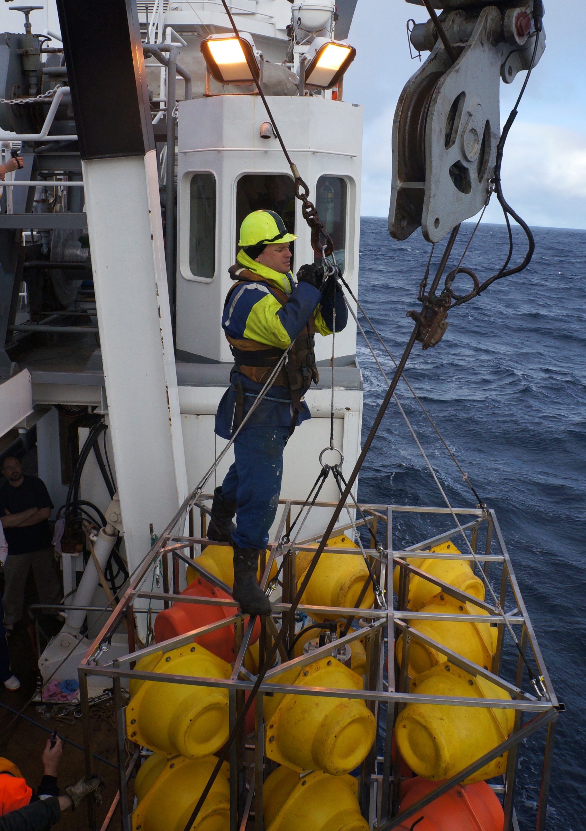 Shane Harvey attaching the echosounder to the mooring line.