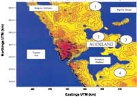 Auckland Region contour map with ozone monitoring stations shown as circled numbers: 1 = Whangaparaoa, 2 = Sky Tower, 3 = Musick Point, 4 = Pukekohe
