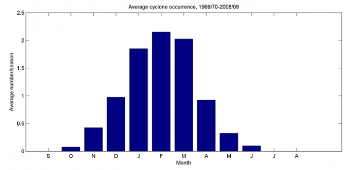 Figure 2: Average number of tropical cyclones from 1969-2009 that have occurred in each month of the season in the southwest Pacific.