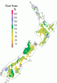 Average July river and stream flows(%) at monitored catchments. NIWA field teams, regional and district councils, and hydro-power companies are thanked for providing data.