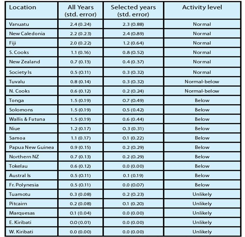 Average number of TCs passing within 5° of the main island groups between November - April. Activity level (and associated risk) are indicative of how many storms might be expected for any given island group for the current season.