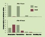 Average number of paua larvae (dead and alive) on surfaces after 4 and 48 hours in the jars.