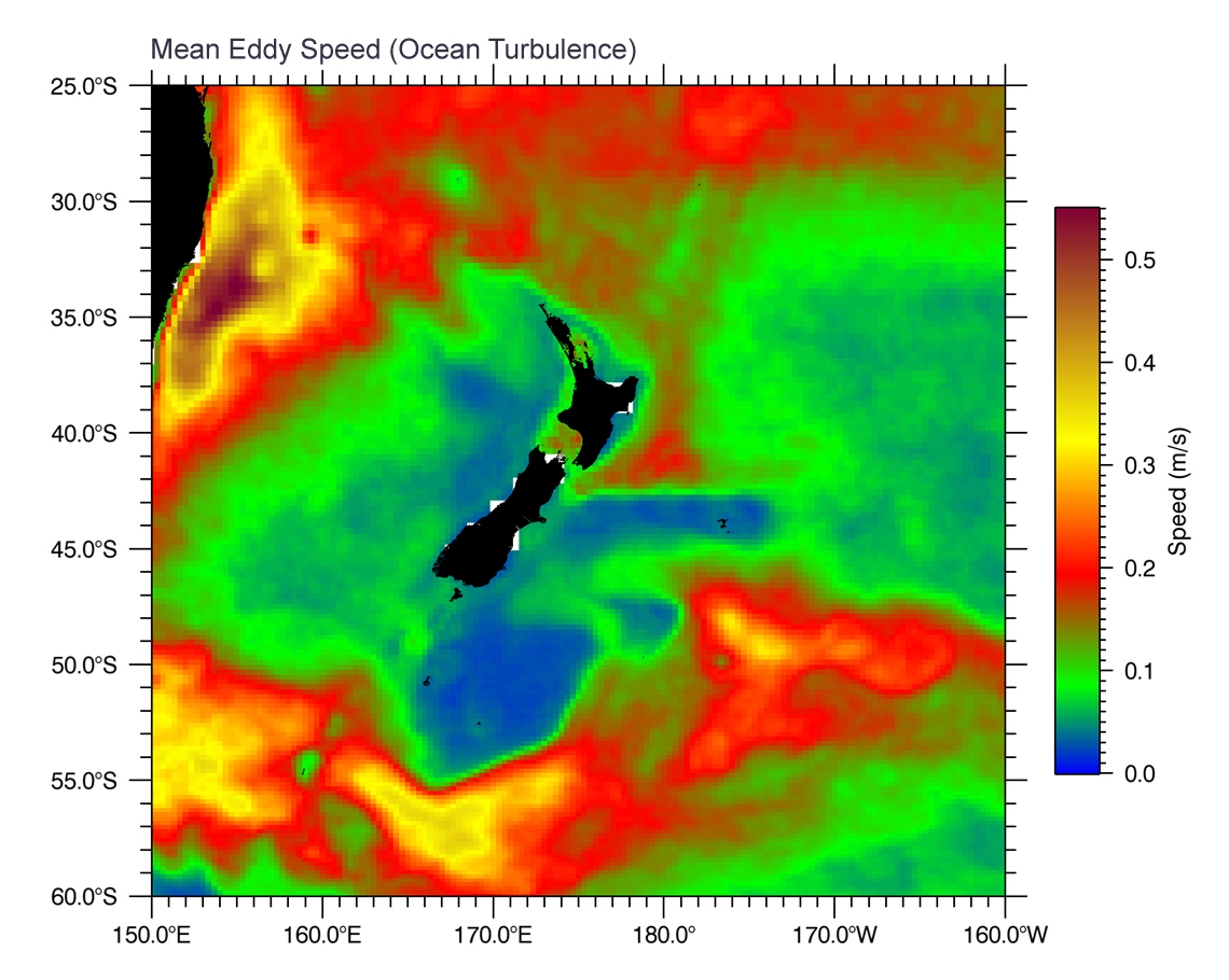 Mean eddy speed, representative of the level of ocean turbulence (based on AVISO data).