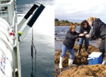 Bacteria are found throughout the marine environment. Taking a deep-sea sediment core (left) (Photo: John Mitchell) and Els Maas, Andrea Shaw, and Antonia Arlidge (left to right) collect samples for culturing marine bacteria from a rocky shoreline. (Photo