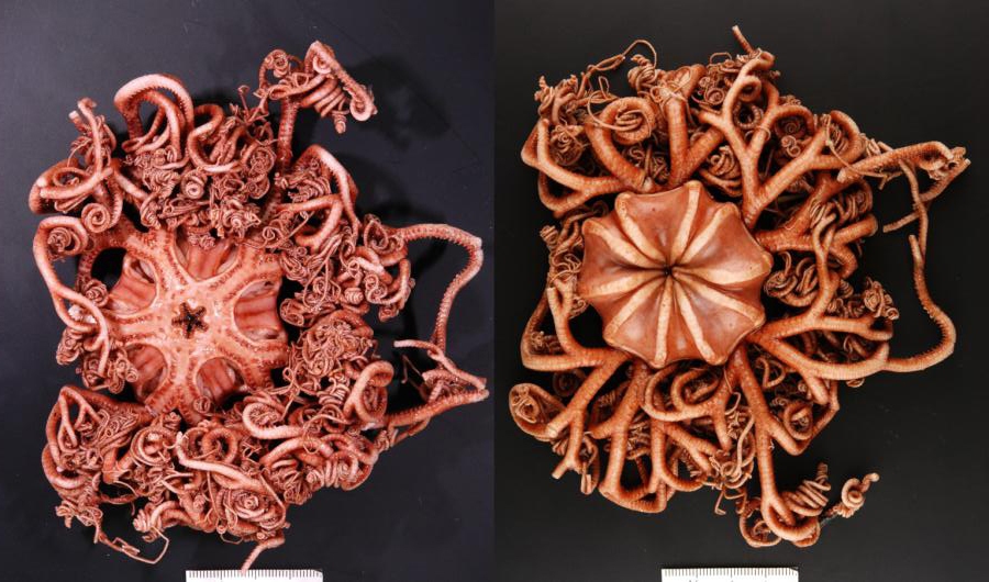 When stressed basket stars curl up into a ball, so this is what our specimens normally appear like. A top and bottom view of Gorgonocephalus pustulatum collected from around 1000m depth on the Chatham Rise. On close inspection, the disc looks much more familiar brittle-star shaped.