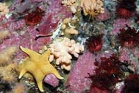Benthic community at Terra Nova Bay, Ross Sea, including: encrusting coralline algae, seastars, and sea urchins camouflaged with pieces of drift red algae. (Photo: Rodd Budd, NIWA)