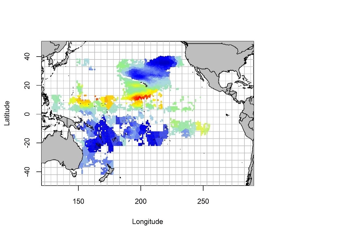 Fine-scale (10 x 10 km) relative density estimates for bigeye thresher shark, 2000–2014, as predicted from modelled observer data. The density scale goes from dark blue (lowest) to red (highest).