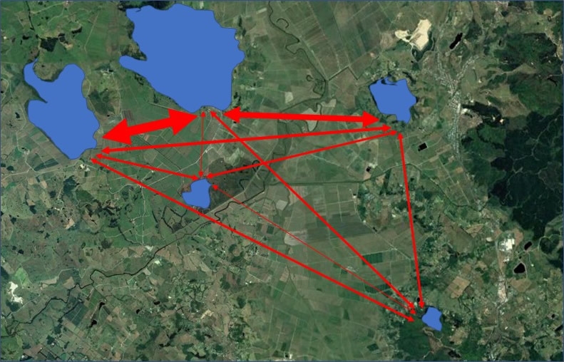 Lakes in a landscape indicating the strength of interlinkages according to size of the waterbody (attractiveness) and distance to travel.