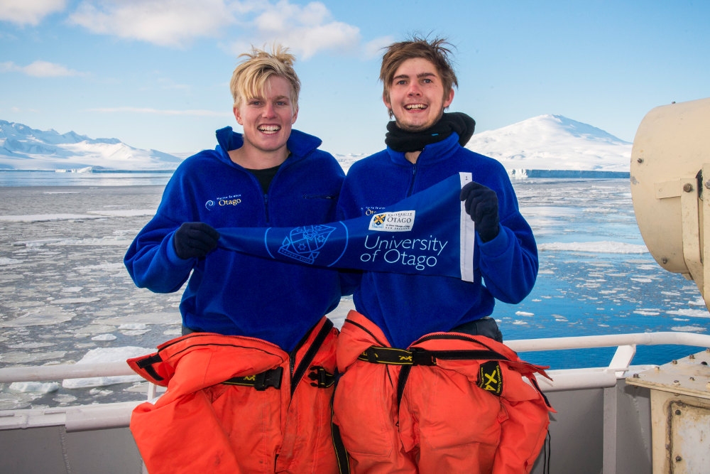 Blake (left) and I (right) holding our Otago University flag at Terra Nova Bay. Photograph by Dave Allen.