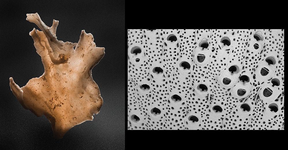 Credit: left specimen image Dave Allen/ NIWA; right SEM image Dennis Gordon/ NIWA.