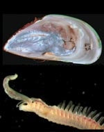 Broken blister inside an infested mussel shell (top) and head region of a live worm. (Photos: G. Read)