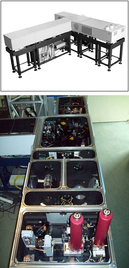The Bruker 125HR Spectrometer (top) and an inside view of our instrument (bottom).