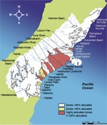 Canterbury groundwater allocation zones showing, in red, the zones where initial estimates of the maximum groundwater allocation allowed by the interim policy is less than the existing allocation. (Environment Canterbury)