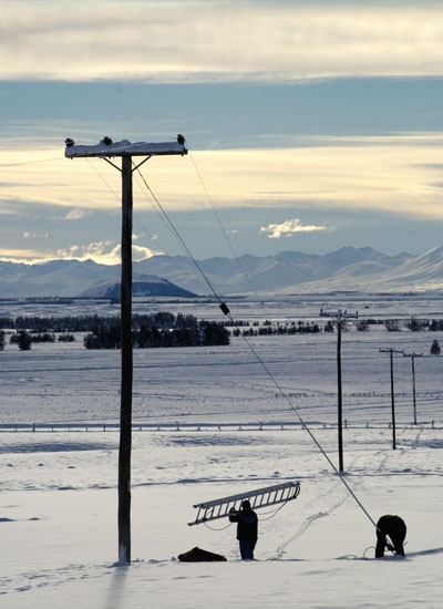 Canterbury snowscape. Line engineers contended with knee-deep snow and restricted vehicle access to restore electricity supplies. (Photo: Alan Blacklock)