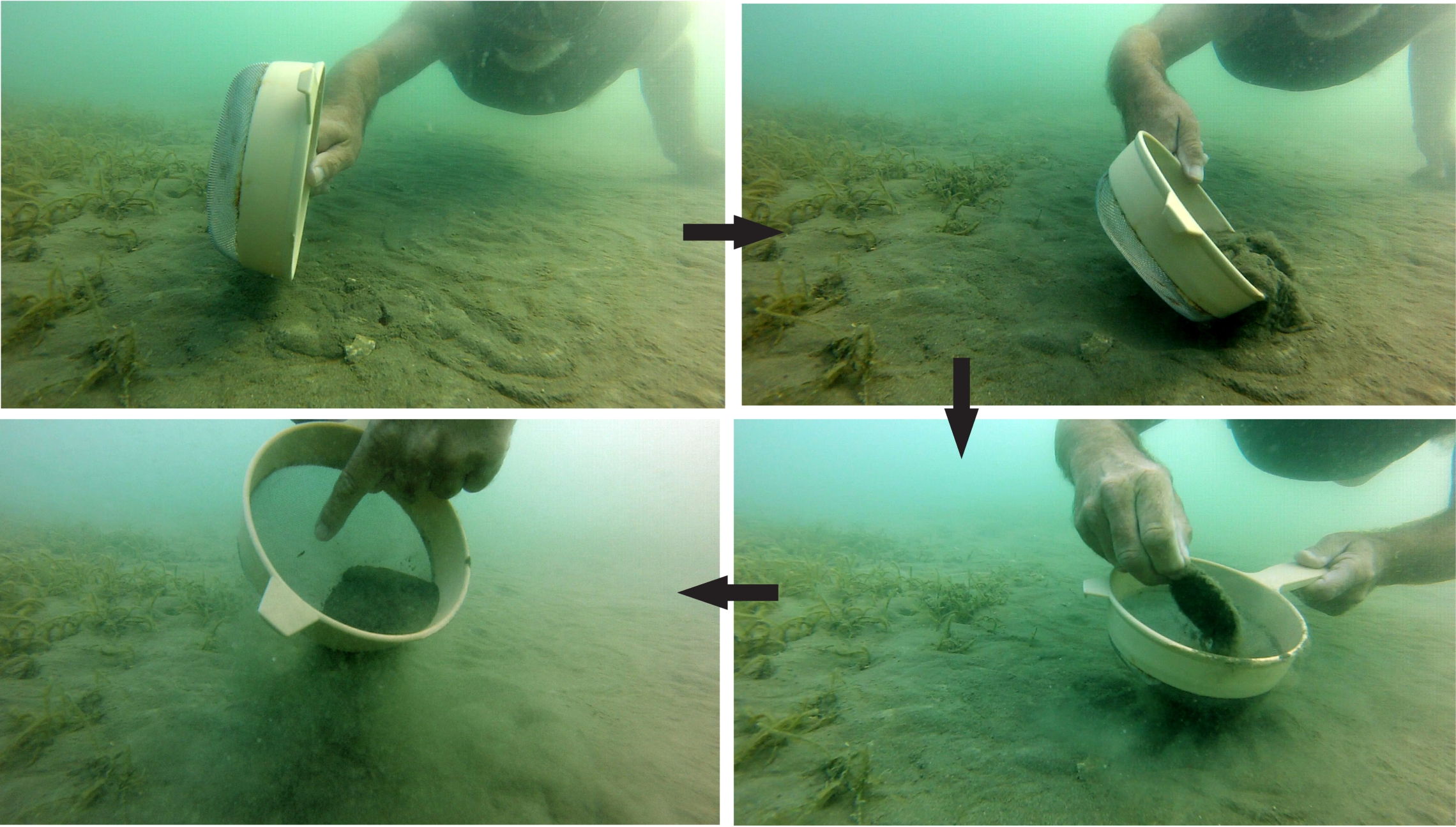 Capturing Oxydromus sp. present under sand-dollar urchins. A clockwise sequence with the last image showing the little worm trapped in the sieve. Photographed in shallow water at Whangaparaoa Peninsula.