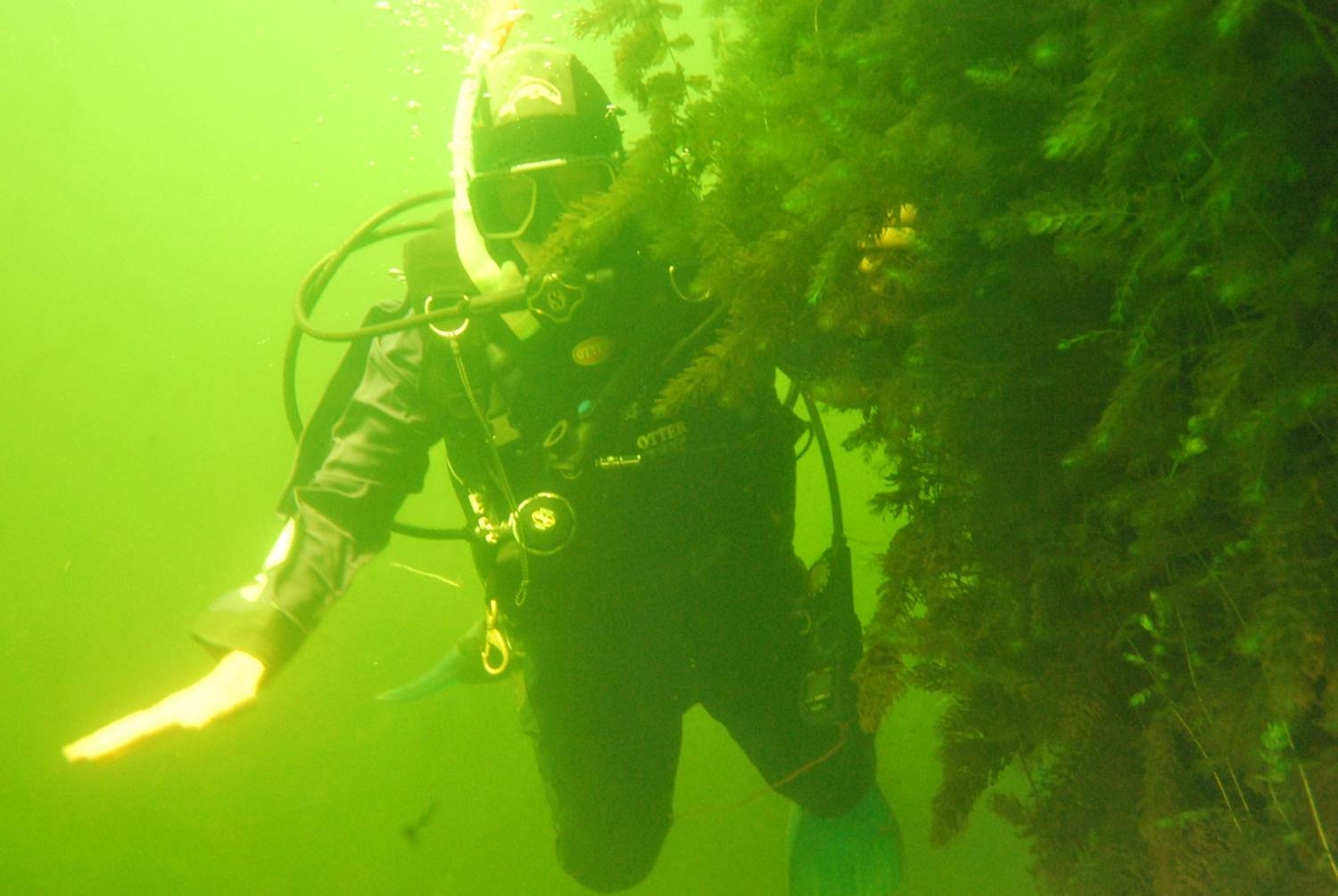 A diver adjacent to a dense weed bed of Ceratophyllum demersum. Credit: Rohan Wells