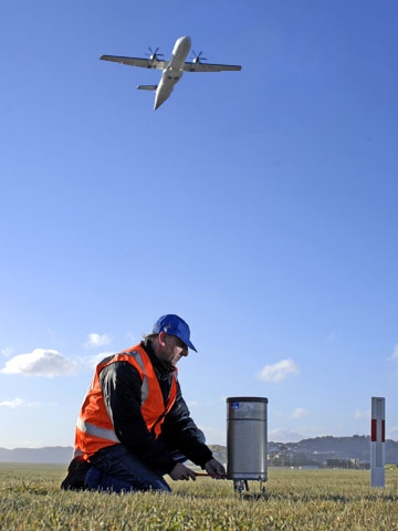 Checking an automatic rain gauge at Wellington Airport. Close attention to instrument accuracy and reliability ensures users of the National Climate Database can rely on the quality of the data. (Photo: Alan Blacklock)