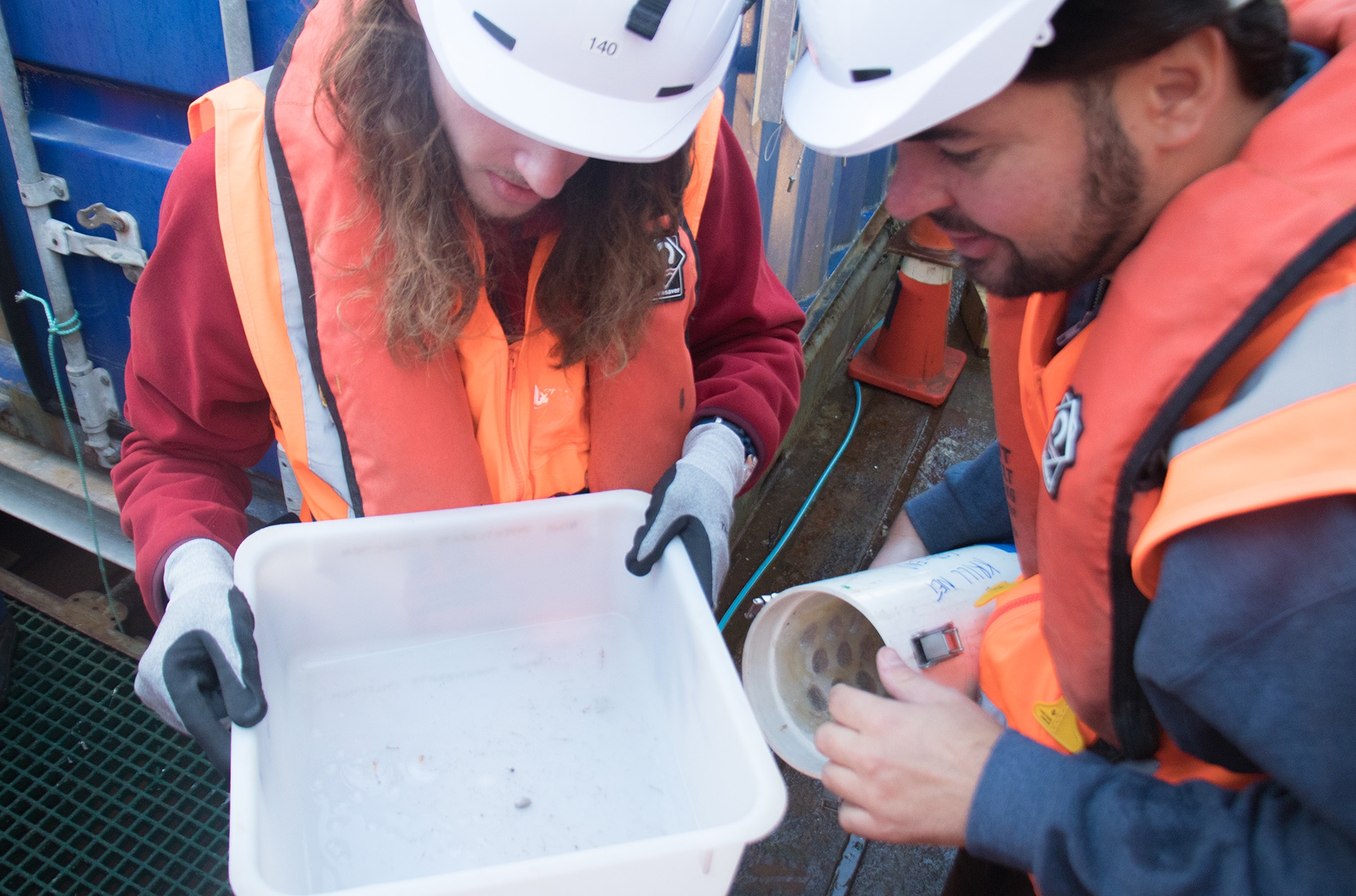 PhD students Christian Fender (Florida State University) and Florian Luskow (University of British Columbia) find no salps from the first plankton tow, but are curious about a baby squid. [Photo: Lana Young]