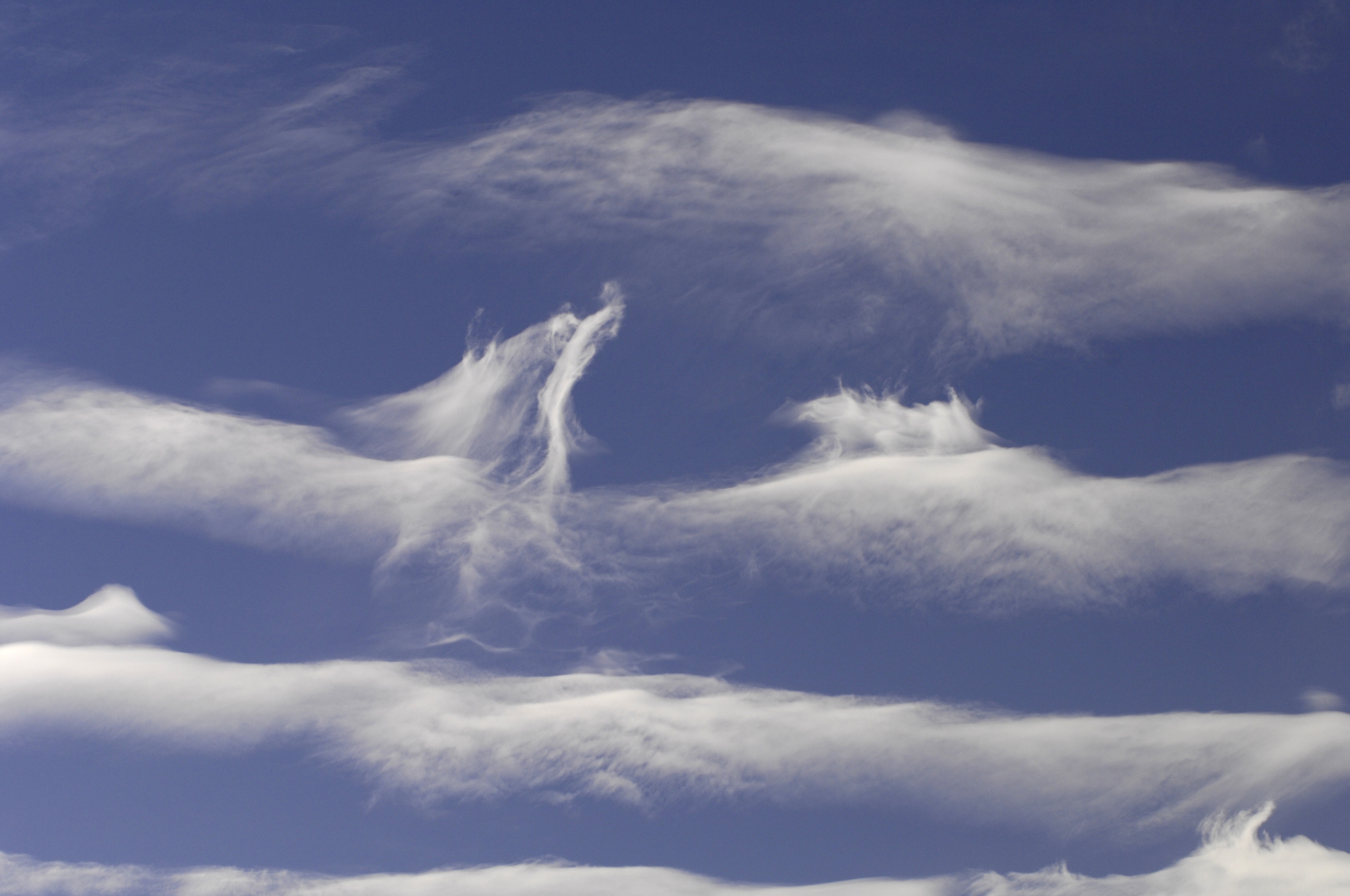 Wispy, white and made of ice crystals cirrus clouds are usually found at altitudes of 5000m or more in New Zealand. They are often seen ahead of a front, and may indicate deteriorating weather conditions. Streaks of cirrus are sometimes called mare's tails. Photo taken by Alan Blacklock in 2008.
