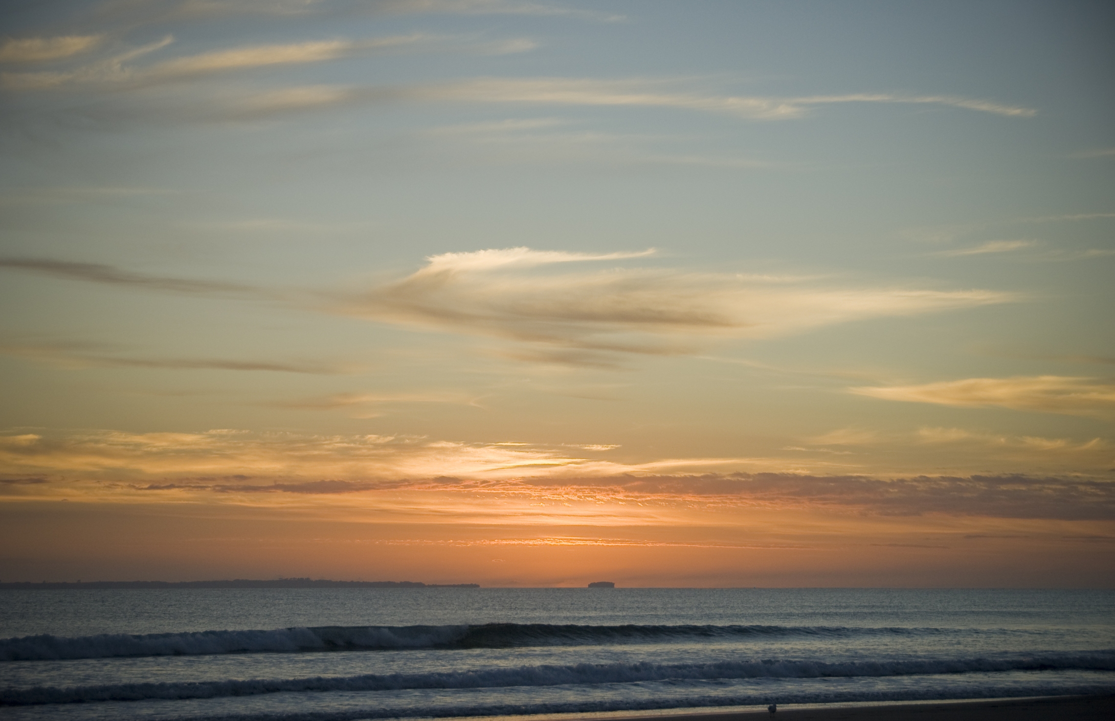 Wispy, white and made of ice crystals cirrus clouds are usually found at altitudes of 5000m or more in New Zealand. They are often seen ahead of a front, and may indicate deteriorating weather conditions. Streaks of cirrus are sometimes called mare's tails. This image, taken at sunrise near Mt Maunganui, NZ, also shows a layer of stratocumulus close to the horizon. Photo taken by Dave Allen.