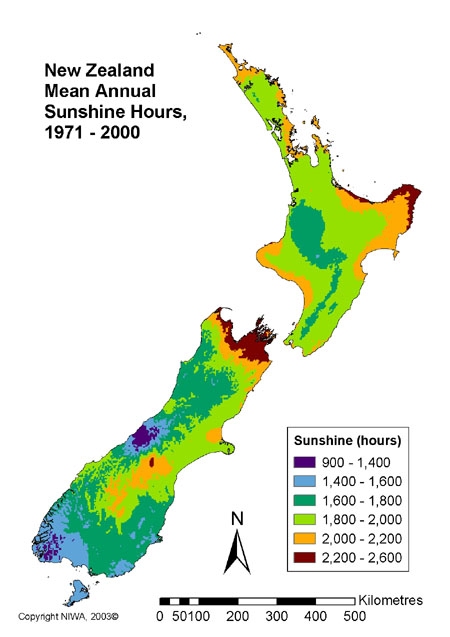 Climate - NZ annual sunshine hours 1971-2000 (click to enlarge)