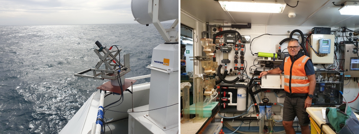 Left: Hyperspectral ocean colour sensor. [Photo: Mark Gall] Right: Mark Gall with Tangaroa underwater sampling system.