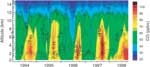 Colours show the concentration of carbon monoxide measured by Fourier Transform Spectrometer at Lauder.
