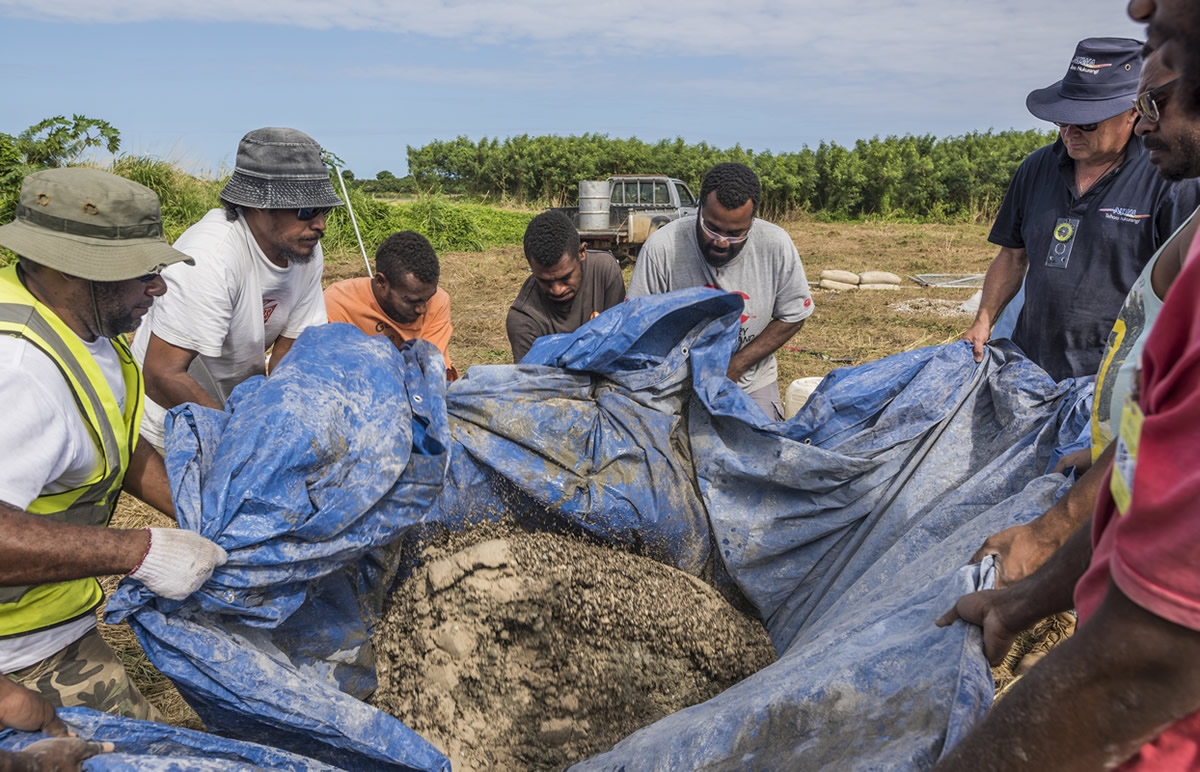 Mixing concrete – island style. The concrete foundations for the weather station will help the instruments hold up to extreme winds that are likley in future cyclones.
